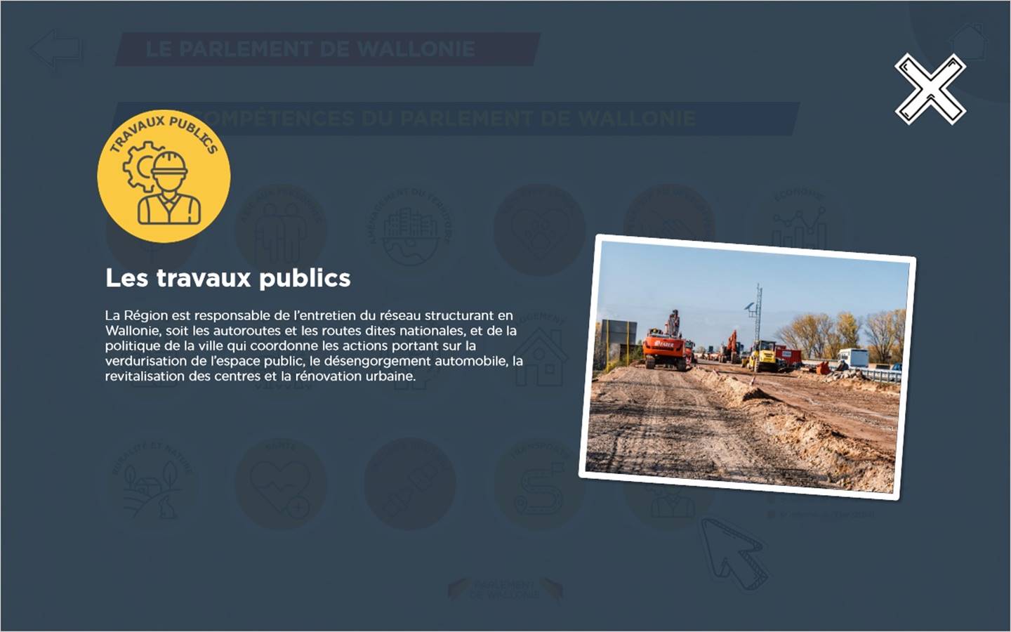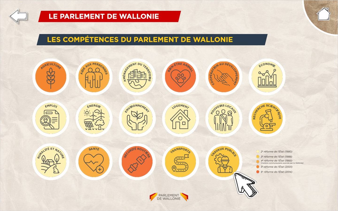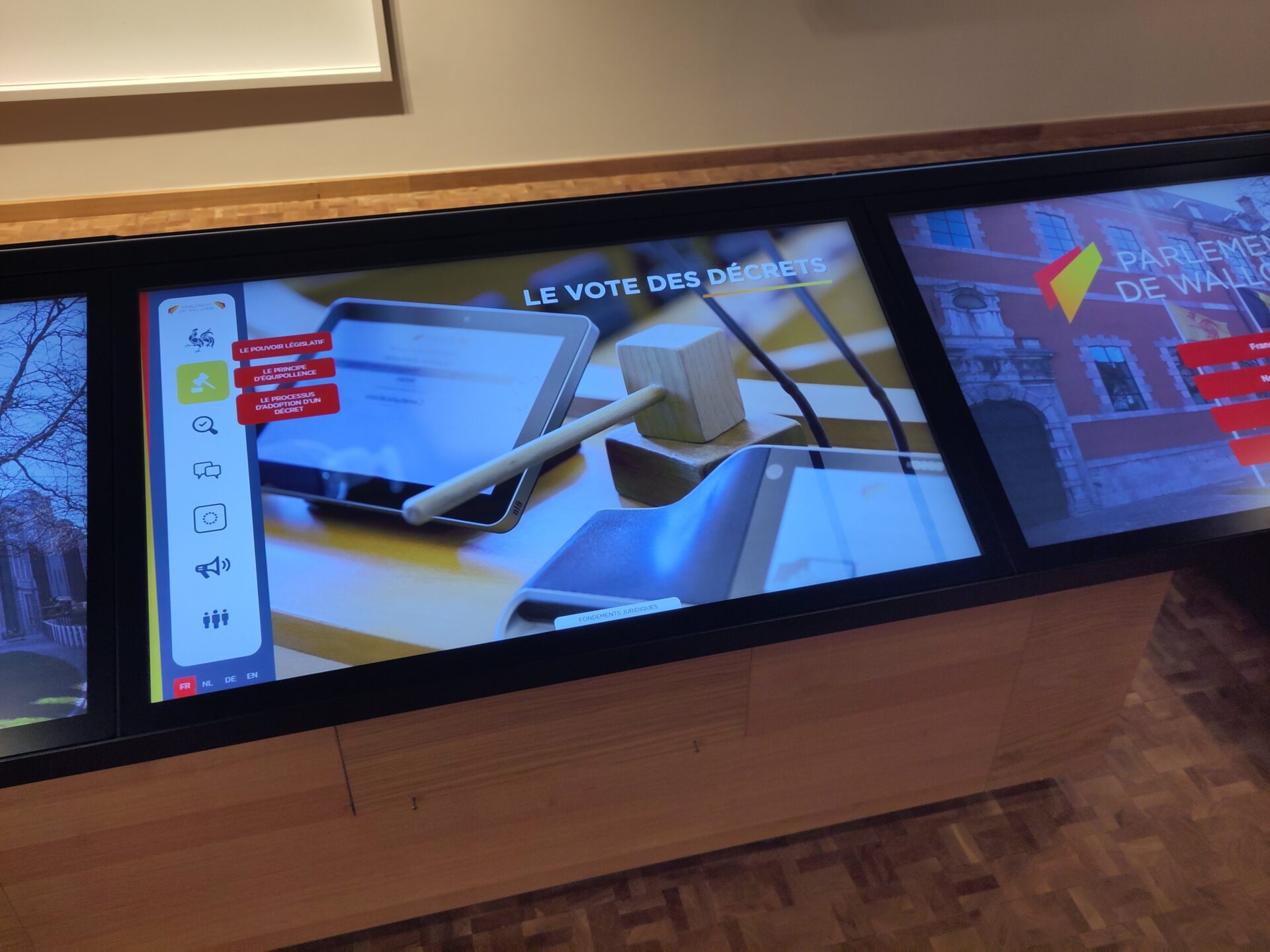 Pour le Centre des visiteurs du Parlement de Wallonie, nous avons développé une série de bornes interactives permettant aux visiteurs – jeunes et adultes – de découvrir de façon ludique et pédagogique le fonctionnement de l’institution parlementaire.