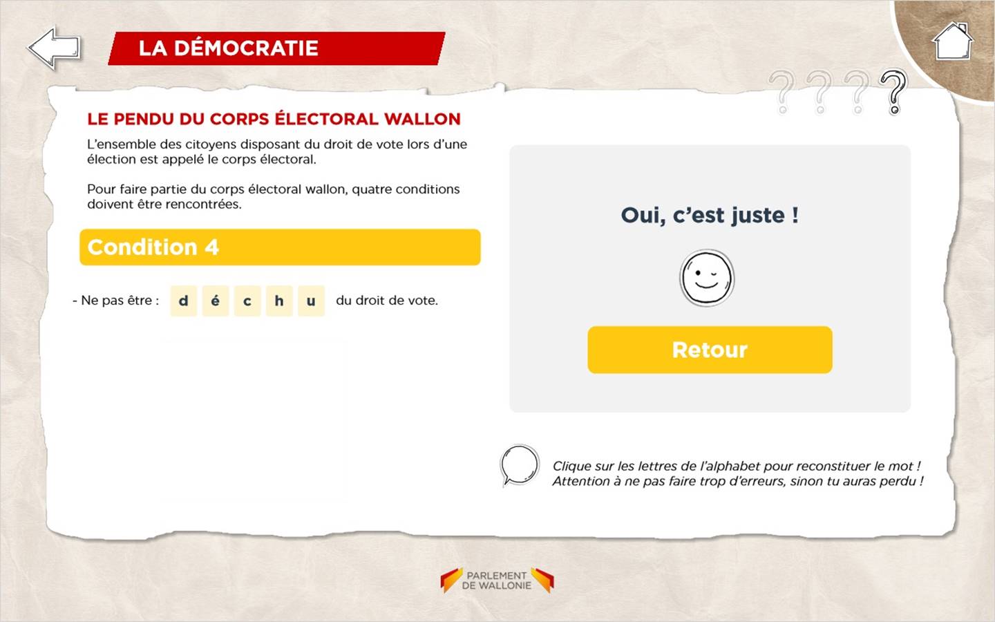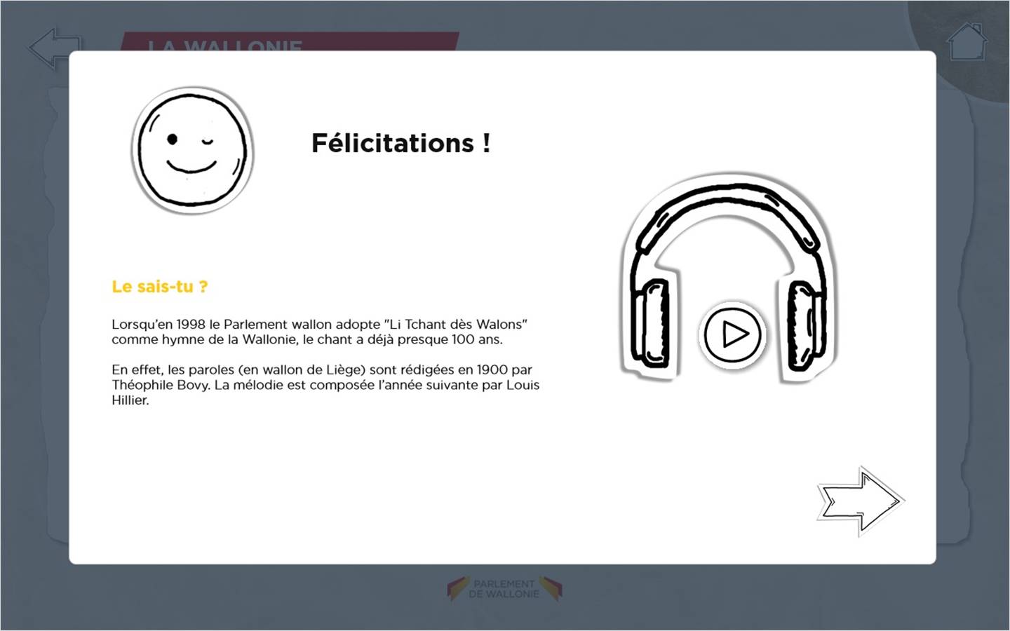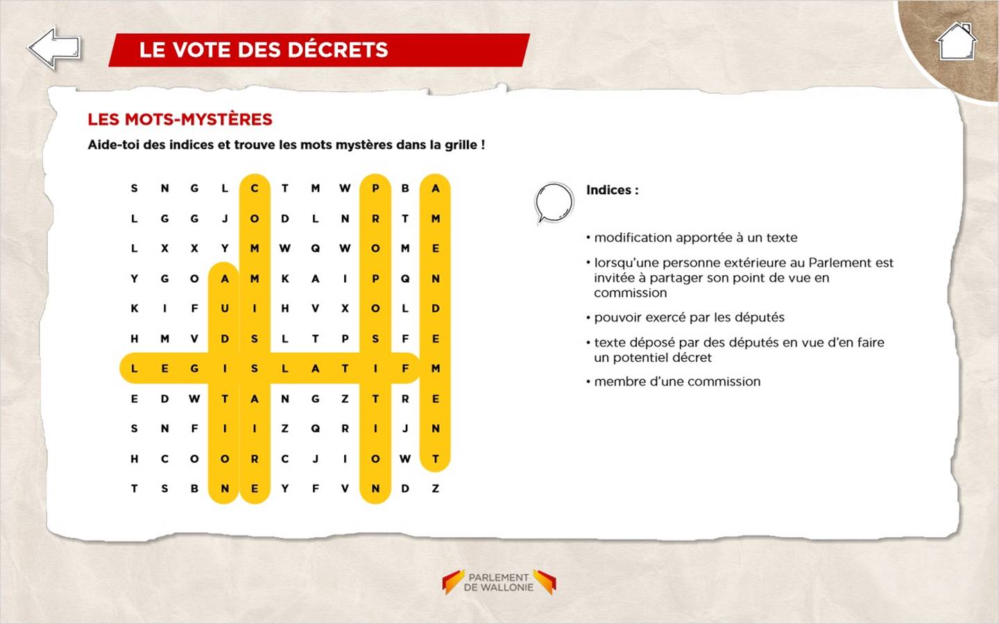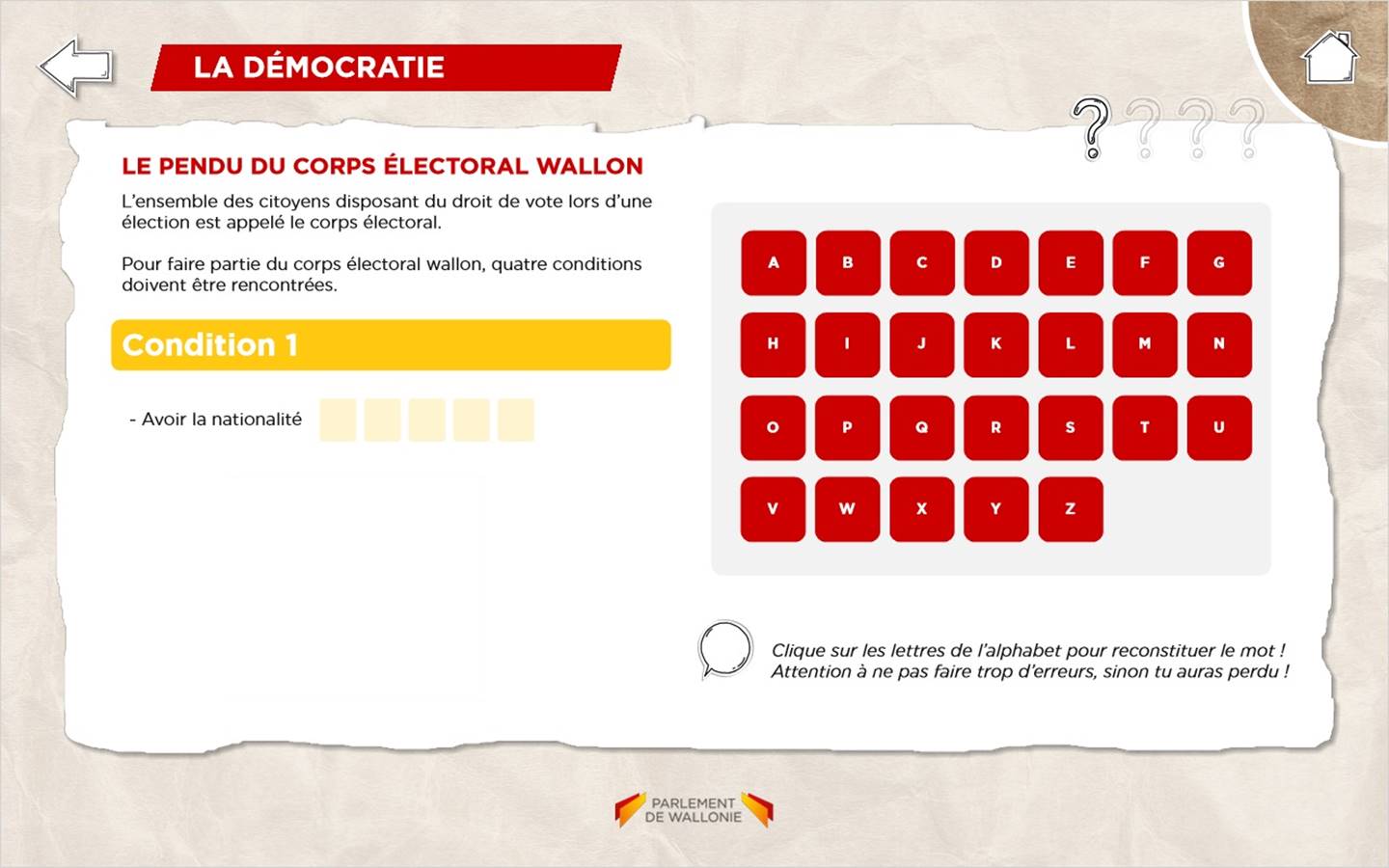 Pour le Centre des visiteurs du Parlement de Wallonie, nous avons développé une série de bornes interactives permettant aux visiteurs – jeunes et adultes – de découvrir de façon ludique et pédagogique le fonctionnement de l’institution parlementaire.